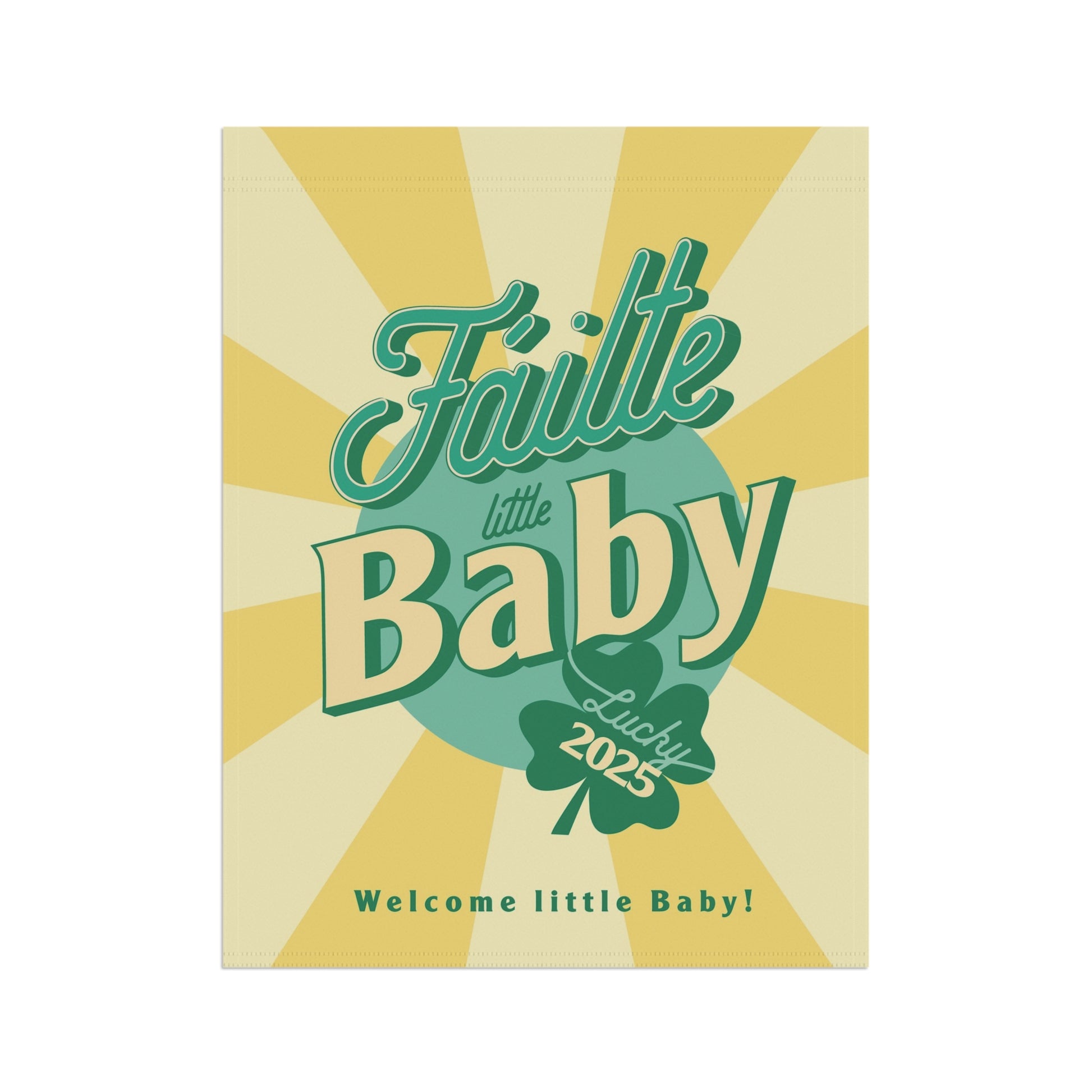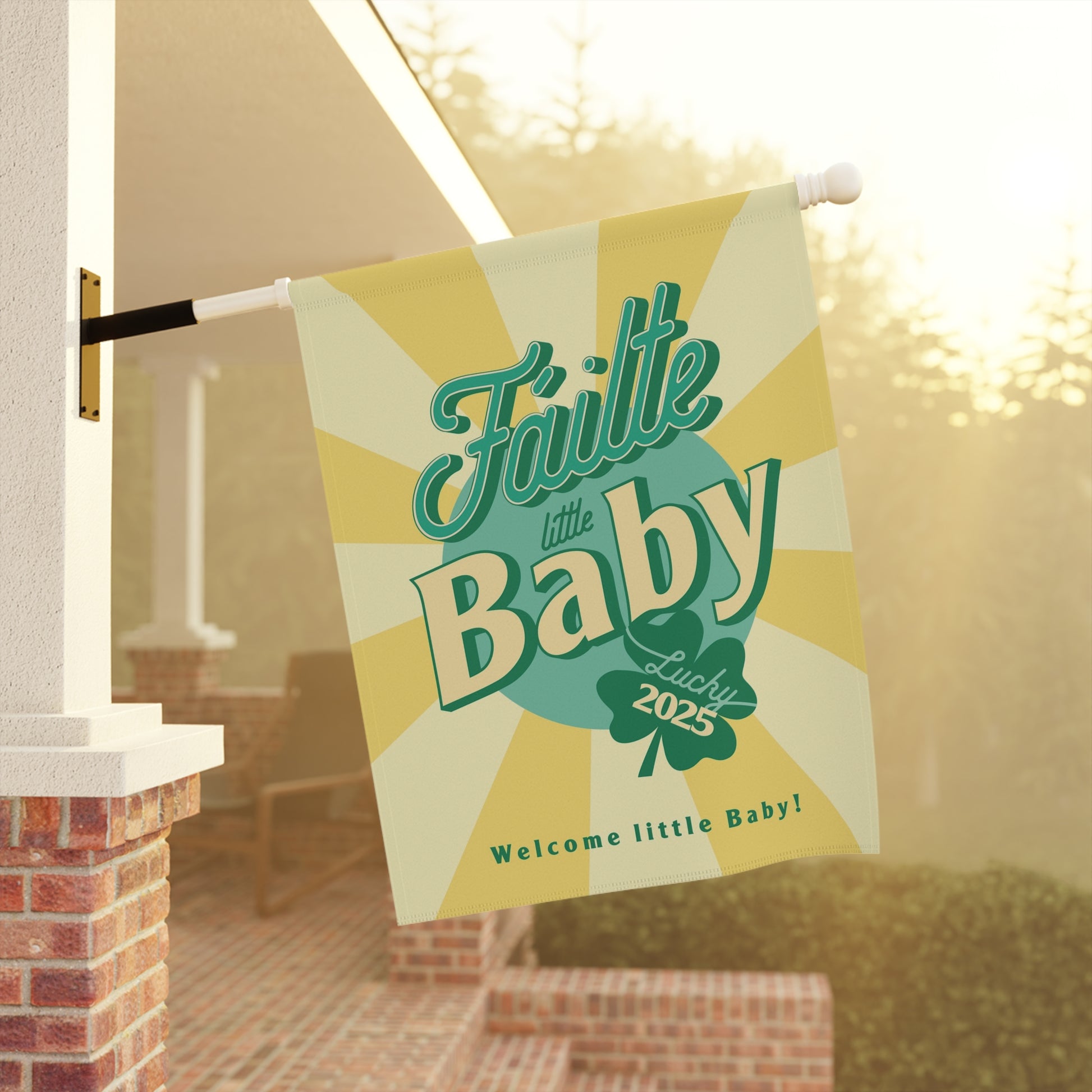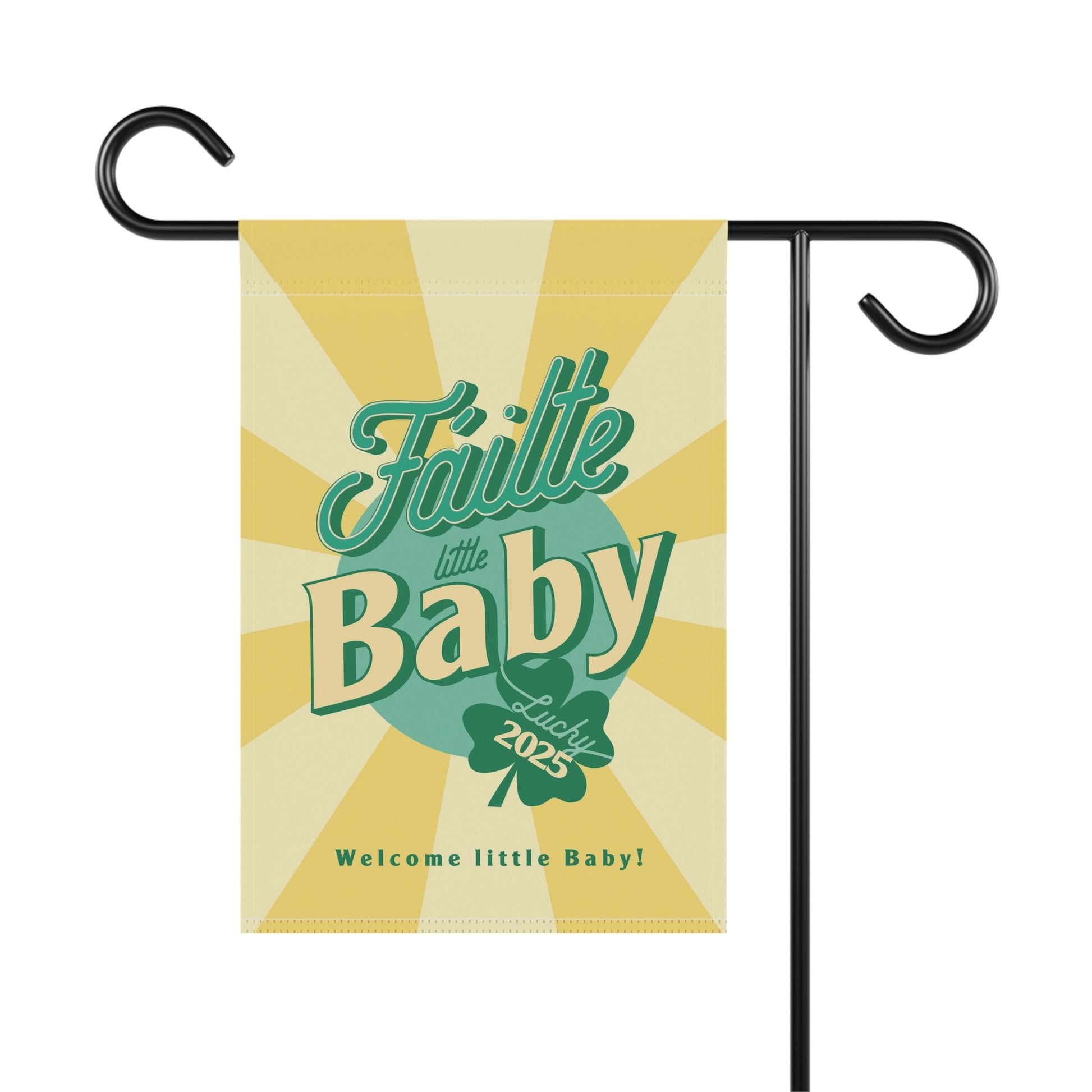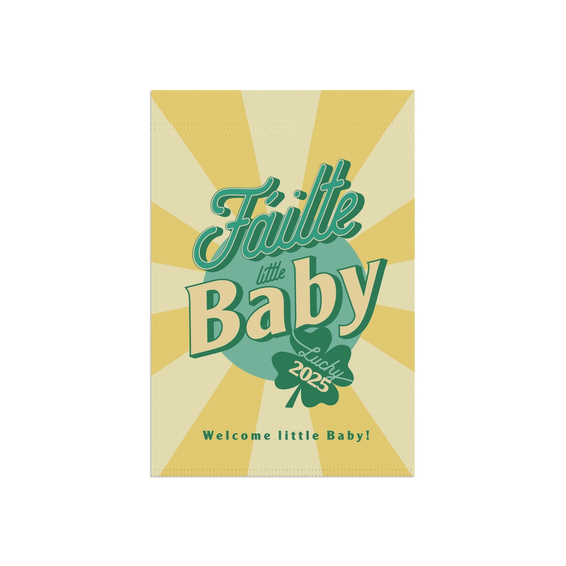 Celebrate a new baby with this Irish garden flag, featuring vibrant colors and a sleeve at the top for easy hanging. Perfect for creating a festive and welcoming atmosphere in your garden or house. Ideal for those looking to add a touch of personalization to their outdoor space, especially during St. Patrick's Day or baby showers.